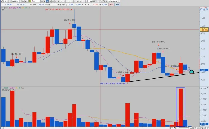 우 상향 추세 라인의 저점 구간에 주가가 있고, 최근에 많은 거래량이 나왔습니다.