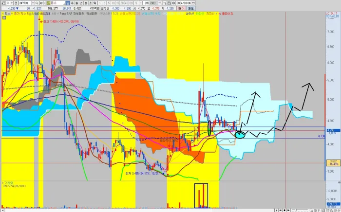 기준봉의 저가로 손절가는 4130원입니다. 기간 조정이 남아있어서 시간은 조금 걸리겠네요. 상패의 위험성이 거의 없으므로 시간 투자 하시면 좋은 결과가 있을 것으로 예상됩니다. 목표가는 6000원 부근으로 잡겠습니다.