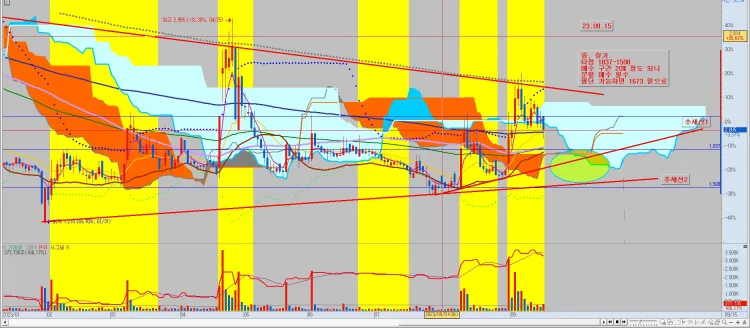 이 차트에서 확인할 수 있는 것은 현재 큰 흐름은 아직 하락 추세를 이어가고 있고, '하락 삼각수렴을 진행하고 있는 중이다'라는 것을 알 수 있습니다. 수렴을 하는 동안 세력의 흔적이 나타났고, 이제 서서히 삼각수렴이 마무리되어가고 있다는 것도 알 수 있죠. 자 그렇다면 아래 단기 차트를 보면서 이 종목의 공략 방법을 살펴봅시다.